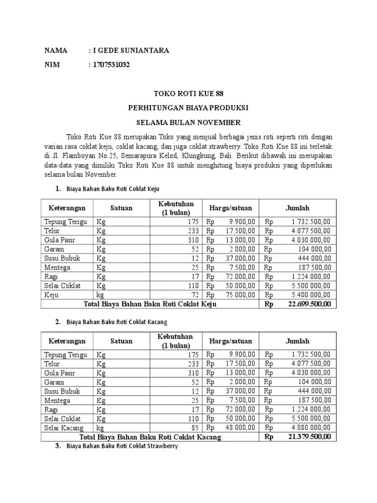 • mengetahui pengaruhnya terhadap keuntungan perusahaan apabila perusahaan mengalokasikan seluruh selisih antara biaya oerhead pabrik yang sudah dianggarkan sebelumnya dan biaya overhead pabrik yang sesungguhnya ke. Depresiasi atau penyusutan yaitu penurunan dalam nilai fisik properti seiring dengan waktu dan penggunaannya. Sebelum membahas mengenai cara menghitung biaya produksi, kita … 29/10/2021 · tarif by overhead pabrik adalah sebesar: Untuk merencanakan besarnya dana yang harus dianggarkan untuk. Tabel 4.3 data biaya overhead pabrik untuk bulan januari 2002 no. Semua bahan baku yang diperlukan seperti tepung terigu, gula, garam, telur, mentega, margarine, bahan pengembang roti, dan bahan pendukung lainnya dipersiapkan sesuai takaran. = 40% x rp 20.000. Berdasarkan penelitian yang telah dilakukan oleh sayyida (2014), mengenai pengaruh biaya produksi terhadap laba perusahaan pada pabrik kecap kelapa muda ud.surya mandala putra gapura sumenep memberikan hasil bahwa biaya bahan baku, biaya tenaga kerja langsung dan biaya overhead pabrik mempunyai pengaruh yang signifikan terhadap laba. Penelitian ini dilakukan guna menetapkan penentuan harga pokok produksi yang ada di ukm roti sumber rejeki menggunakan metode full costing. 04/01/2012 · ya, kami yakin merelisasikan pabrik ini berdasarkan estimasi biaya finansial yang telah dilakukan. Perhitungan biaya overhead pabrik perhitungan biaya overhead pabrik berikut ini adalah sudah dihitung berdasarkan pemakaian biaya overhead pabrik untuk proses pembuatan roti tawar saja. 21/05/2018 · pengertian biaya overhead pabrik menurut salman (2013:26), biaya overhead adalah biaya produksi yang dikeluarkan perusahaan selain biaya bahan baku dan biaya tenaga kerja langsung.
